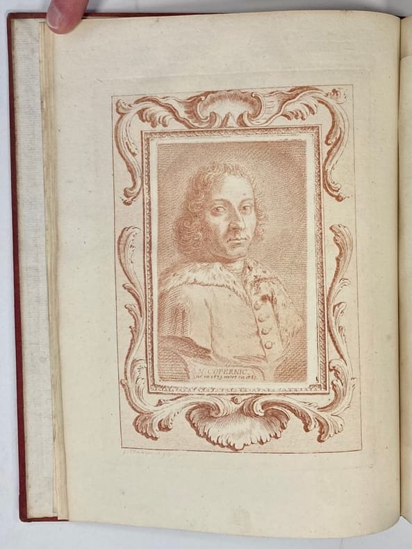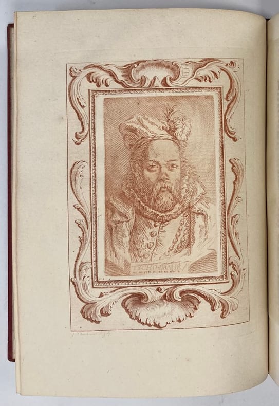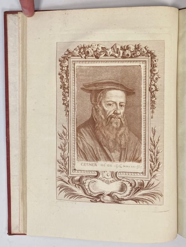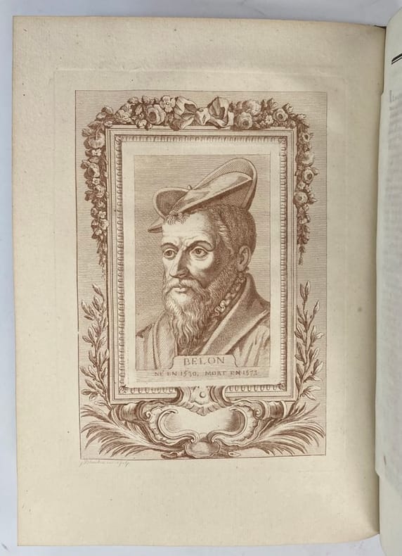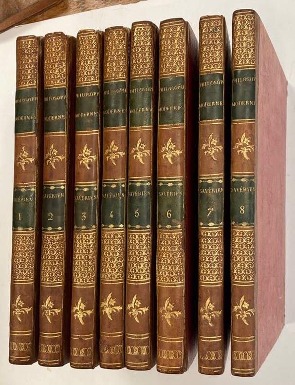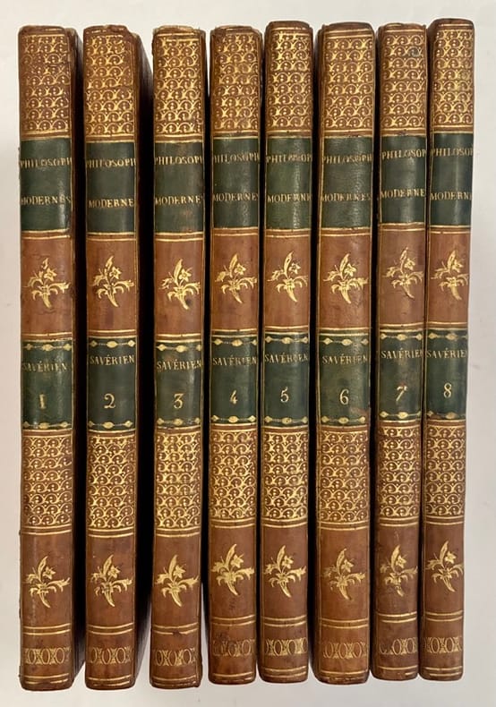 Luxueuse édition in-4 de cet ouvrage précieux pour son illustration, gravée à la manière du crayon et tirée en sanguine. C'est l'oeuvre du graveur Jean-Charles François qui fit de nombreuses découvertes dans l'art de la gravure, imitant le dessin et même l'aquarelle d'une façon extraordinaire (Benezit). Graveur et imprimeur français, ayant obtenu le titre de « Graveur des Desseins du Cabinet du Roi », il fut le promoteur en France d'une façon de reproduire le trait des dessins en gravure, appelée manière de crayon, qui combine l'usage d'un vernis mou, d'une roulette et d'un instrument composé de fines aiguilles, et de procédés de gravure préfigurant l'aquatinte. L'illustration se compose de 8 frontispices allégorique, 8 titres-frontispices et 75 portraits ou allégories hors texte (dont plusieurs répétées) des principaux philosophes et savants modernes accompagnés de notices biographiques d'après Alexandre Julien Savérien, philosophe et mathématicien, ami de Bernoulli, qui composa en 1742 un Discours sur la navigation et la physique expérimentale. Les principaux personnages cités sont Érasme, Hobbes, Locke, Spinoza, Grotius, Montaigne, La Bruyère, La Rochefoucault, Bacon, Gassendi, Descartes, Pascal, Newton, Leibnitz, Halley, Bernoulli, Copernic, Tycho-Brahé, Galilée, Kepler, Cassini, Huygens, Rohault, Molières, Gravesande, Paracelse, Lemery, Boerhaave, Agricola, Belon, Tournefort, Réaumur, etc. L'édition originale de l'ouvrage a paru entre 1760 et 1769, en 8 tomes in-4 et in-12. Certains tomes sont en réédition dans notre exemplaire, comme c'est le cas dans les seuls autres exemplaires rencontrés. En voici la composition : I. Histoire des métaphysiciens, 1760 (12 pl.) II. Histoire des moralistes et des législateurs, 1761 (12 pl.) III-IV. Histoire des restaurateurs des sciences, 1761 (23 pl.) V. Histoire des mathématiciens, 1765 (12 pl.) VI. Histoire des physiciens, 1768 (10 pl.) VII. Histoire des chimistes et des cosmologistes, 1769 (10 pl.) VIII. Histoire des naturalistes, 1773 (10 pl.). Seuls les tomes I et V ont un faux-titre ; celui du tome I porte une mention de seconde édition. Les biographies de Wollaston et de Shaftesbury sont ornées d'allégories, mais aussi de portraits, reliés à la fin des tomes III et IV. Exceptionnel exemplaire au format In-4, complet des illustrations, aux armes de la famille italienne Meli Lupi di Soragna, avec ex-libris d'un descendant titré prince de Soragna. Les Meli Lupi est une famille patricienne de Venise, et est celle des Marquis de Soragne. Cohen, 942 Brunet, V, 154.