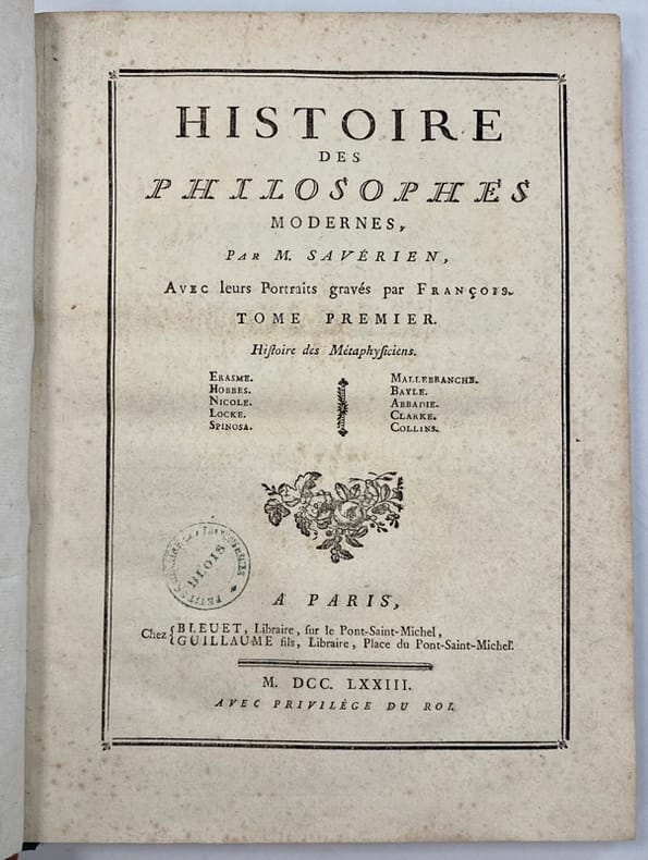 Seconde édition au format in-4, de cette Histoire des philosophes modernes constituée de nombreux portraits des personnalités scientifiques et philosophiques les plus emblématiques du XVIème, XVIIème et XVIII ème siècles. Elle est illustrée de 75 portraits et allégories gravés par Jean-Charles François à l’aide de son procédé « en manière de crayon », et tirés à la sanguine: Bayle, Descartes, Spinoza, Montaigne, Newton ou encore Pascal…Les premiers volumes concernent les philosophes modernes; puis Savérien traite des mathématiciens, des physiciens, des naturalistes... Cachet du petit séminaire de Blois sur les pages de titre.Reliures frottées, manques à plusieurs coiffes supérieures. Infimes rousseurs et mouillures. Cohen, 942.