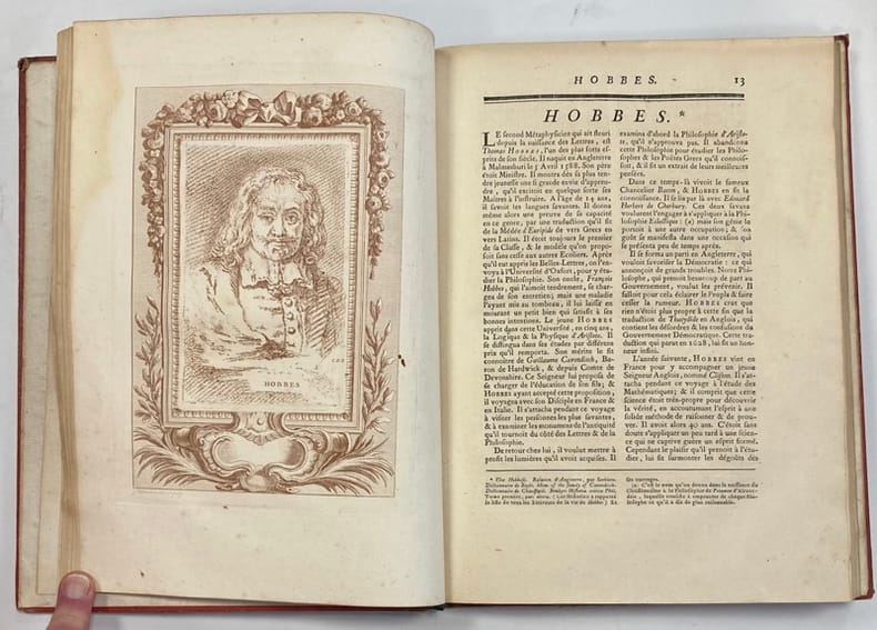 Nouvelle édition de ce recueil de biographies illustrées pour chacune d'un portrait du philosophe en question. Elle comprend également pour chaque volume un frontispice et un titre gravé. Elle contient, en outre, un portrait supplémentaire du philosophe Wollaston au 3e volume, dans le chapitre consacré à Pascal, 1 portrait supplémentaire de Shaftesbury à la fin du 4e (les mêmes que ceux qui illustrent leurs biographies respectives) ainsi qu'une gravure d'un putto au dos du dernier f. du texte consacré à Descartes, une gravure de putti à la fin du texte consacré à Leibnitz et la même à la fin de celui de Bernouilli dans le 4e volume. L'ensemble a été gravé par François. Ex-libris héraldique des Harcourt, de la bibliothèque du château de St Eusoge, propriété de la famille. * Membre du SLAM et de la LILA / ILAB Member. La librairie est ouverte du lundi au vendredi de 14h à 19h. Merci de nous prévenir avant de passer,certains de nos livres étant entreposés dans une réserve.