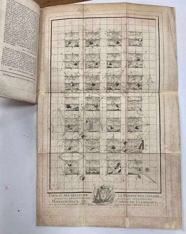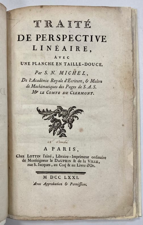 Edition originale illustré d'une grande planche dépliante salie. Cet ouvrage de Michel est une synthèse claire et pédagogique, un pont entre les mathématiques et les arts, permettant aux artistes de comprendre facile les principes de perspective linéaire. Restauration en marge et aux coins de nombreux feuillets. Infimes rousseurs.