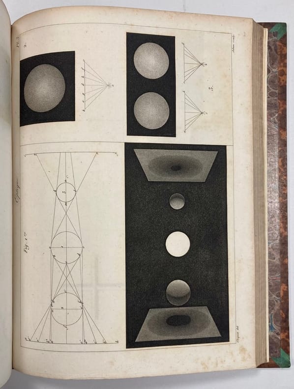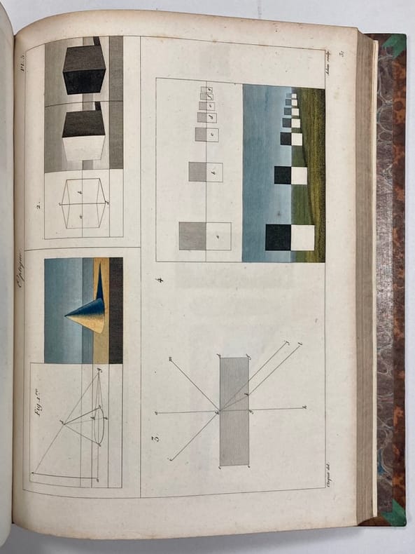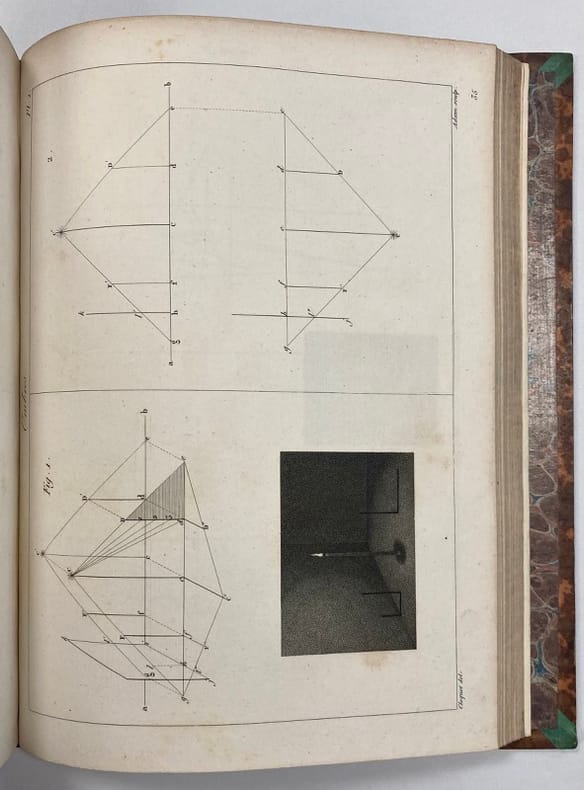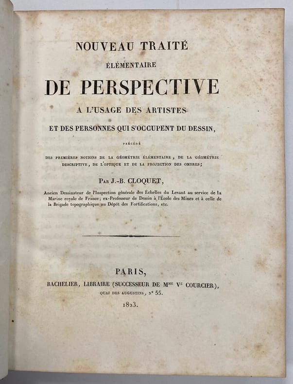 Edition originale de ce traité de vulgarisation sur la perspective réalisé par Cloquet, professeur à l’école des Mines de Paris, et illustré d’un atlas comprenant 1 page de titre et 84 planches, dont 5 coloriées.…précédé des premières notions de la géométrie élémentaire, de la géométrie descriptive, de l’optique et de la projection des ombres.Rousseurs. Tache p.195. Déchirure sans manque sur la page de titre de l’atlas.Charnières légèrement frottées, 1 mors fendu. Quérard II, 231 pp.