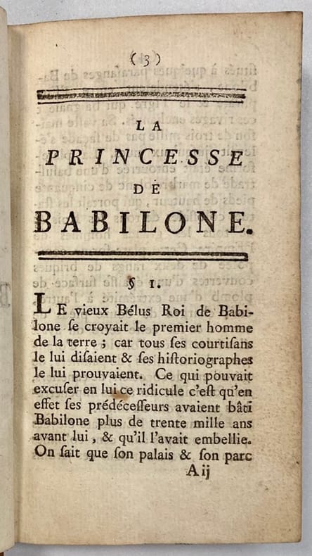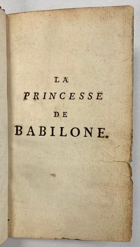 Seconde édition, parue la même année que l'édition originale. "Cette réimpression n'a qu'un faux-titre, sur lequel on lit : La princesse de Babilone".Ce roman philosophique illustre les idées des Lumières, notamment la critique de l’intolérance et de l’arbitraire. À travers un récit exotique et ironique, Voltaire défend la raison, la liberté et l’ouverture aux autres cultures.Ex-libris imprimé ‘« L. B.M. 1770 ».Petit accroc en marge de la page de faux-titre et déchirure marginale sans manque p. 171-172. Quelques rousseurs. Reliure légèrement frottée.Bengesco, 1493.