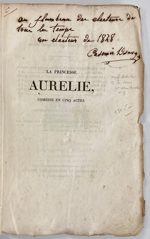 Edition originalePièce représentée le 6 mars 1828 par les comédiens ordinaires du Roi.Envoi autographe signé de l’auteur: "Au flambeau des électeurs de tous les temps, un électeur de 1828. Casimir Delavigne".Couverture abimée. Rousseurs.Vicaire III, 108.