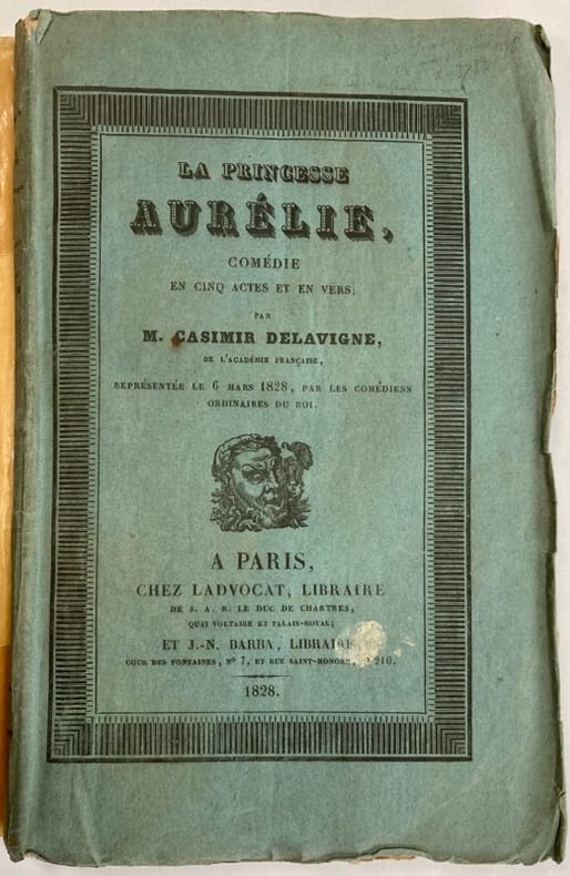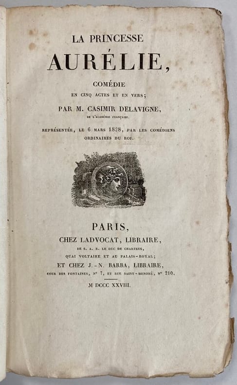 Édition originale de cette pièce représentée pour la première fois le 6 mars 1828 par les comédiens ordinaires du Roi. Portée par Mademoiselle Mars dans le rôle-titre, cette comédie ne connut cependant qu’un bref succès.Petit accroc à la couverture. Rousseurs et mouillures éparses.Bibliographie : Vicaire III, 108. – Talvart et Place IV, 113, n°22.