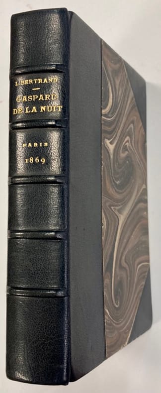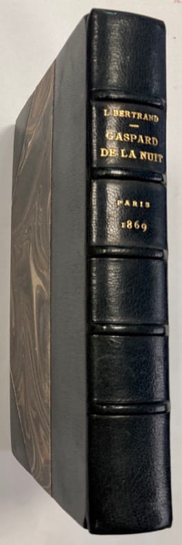 Paris chez René Pincebourde Bruxelles Librairie Européenne de C Muquardt 1868. In-8 1 feuillet blanc avec la marque de Poulet-Malassis imprimée en rouge au verso, 3 feuillets non chiffrés (justificatif de tirage, faux-titre, titre), II-XXVIII (introduction), 1 feuillet non chiffré, 4-276pp, 2 feuillets non chiffrés (erratum, prospectus de la Collection Curiosités Romantiques, Gaspard de la nuit étant le premier de la collection et seul paru). Demi maroquin bleu nuit à coins signés, dos à nerfs rehaussés d'un filet perlé, élégants compartiments dorés dans les entrenerfs, tête dorée, non rogné, plats et dos de la couverture conservés, relié vers 1904 par Jean Stroobants. Orné d'un frontispice par Félicien Rops tiré sur Chine. 2e édition, en partie originale (la première, très rare, avait paru en 1842); tirée à 402 exemplaires, celui-ci 1 des 350 numérotés sur papier de Hollande "dit Ruche" portant le numéro "86 R.P". Bel exemplaire décoratif, fort bien relié par Stroobants, complet du texte et du frontispice, l'un des rares à avoir conservé, avant la page de faux-titre, le feuillet portant la marque de Poulet-Malassis, ainsi que le feuillet de justificatif de tirage (ces deux feuillets étant souvent manquants). Talvart et Place I, page 421. Vicaire I, colonne 447.