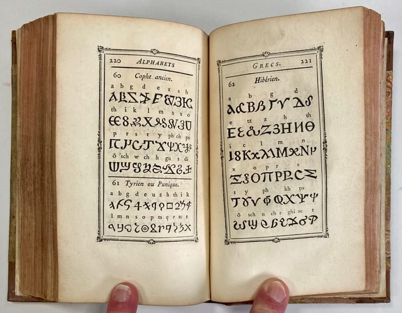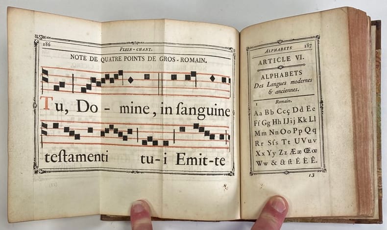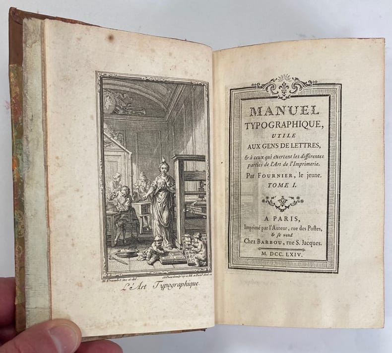 Edition originale et seule parue du plus célèbre traité de typographie par un maitre du genre. Illustré de 16 planches dépliantes à la fin du T.I, répétées à l’identique à la fin du T.II, il est également orné de 2 frontispices d’après Gravelot et De Sève et de 2 titres gravés.L’auteur s’attache d’abord à décrire de manière détaillée les formes de caractère ainsi que les méthodes de gravure et de fonte en les illustrant de nombreux schémas d’outils. Il répertorie ensuite l’ensemble des caractères typographiques proposés, y compris pour des partitions musicales qu’il présente sous forme de 5 planches dépliantes in-texte.Ouvrage de référence qui établit pour la première fois un système de mesure des caractères typographiques, il contribue à la standardisation et à la modernisation de l’art d’imprimer en Europe.Quelques taches et rousseurs. Trace de mouillure sur la dernière planche du T.I. Brunet 1359.