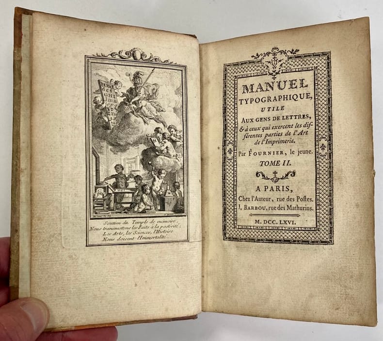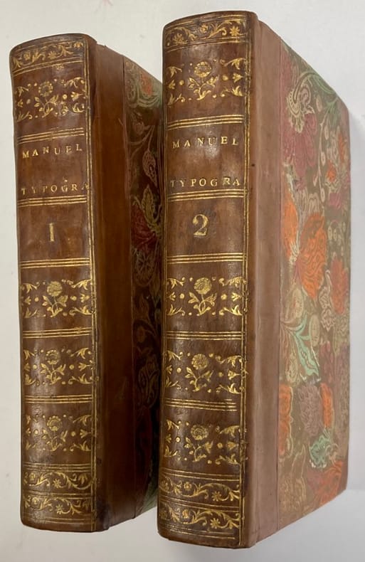 Édition originale. Cet ouvrage, le plus célèbre consacré à l'art typographique, est illustré de deux frontispices gravés, l'un par Gravelot, l'autre par de Sève (non signé) et de 16 planches repliées au tome I montrant les différents instruments propres à cet art. Le second volume est un catalogue de spécimens des caractères français et étrangers, de vignettes et de musique, gravés par Fournier, dont 4 dépliantes et certains imprimés en rouge et noir. Ces spécimens représentent le fonds de Fournier qui influencera l'imprimerie européenne jusqu'à la fin du XVIIIe siècle. Il intervint particulièrement dans le domaine de l'italique en introduisant dans le dessin de la lettre des empattements "romains" et en réduisant au minimum le nombre de lettres liées qui décelaient encore l'origine calligraphique du caractère. Le livre lui-même est un régal typographique. Bel exemplaire. Légère usure aux coins. Brunet, II, 1359 ; Audin, 185-190 ; Bigmore & Wyman, I, 228.