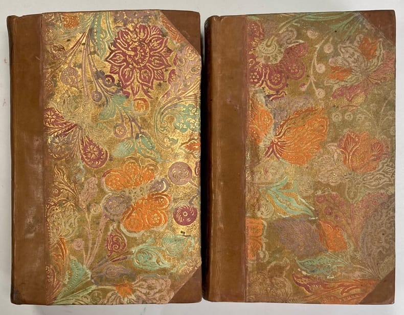 1764 Paris. Imprimé par l’auteur et se vend chez Barbou. 1764-1766. 2 volumes petit in-8, demi-veau blond à coins, plats ornés d’un papier à motifs floraux multicolores sur fond doré, dos lisses ornés. XXXII pp. ; 323 pp. ; (5) pp. ; 16 planches dépliantes - (1) f. ; XLIV pp. ; (1) f. ; 306 pp. ; 16 planches dépliantes.