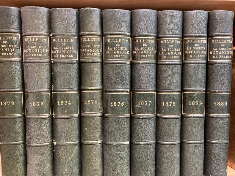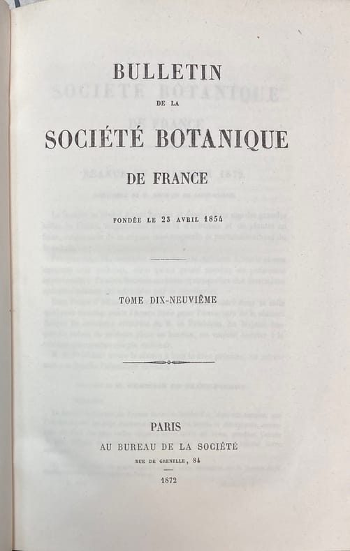 La Société Botanique de France fut fondée le 23 avril 1854. La table générale couvre les années 1854 à 1893. Mouillures sur le 1er tome. Les années 1854, 1858, 1861, 1884, 1885, 1886 et 1906 sont en double, en demi-percaline grenat.