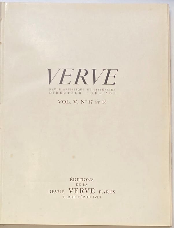 1947 Paris. Verve. 1947. 1 volume in-folio, cartonnage frotté, dos de percaline. Couverture de Pierre Bonnard.