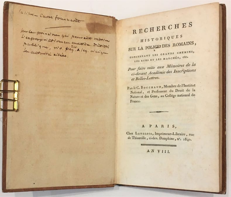 Bouchaud examine les lois romaines sur la voirie et principalement celles qui régissent la sûreté des routes et lieux publics. La France s'inspirera de ces travaux pour le système des postes. Ex-libris de la bibliothèque de Paul Gavault, dramaturge et directeur du théâtre de l'Odéon au début du XXe siècle. Les ventes de sa bibliothèque, entre 1913 et 1953, ne contenaient que des livres romantiques, aussi ce titre ne s'y trouve pas.