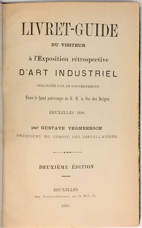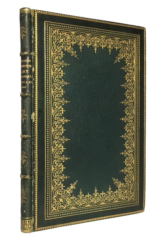 Guide consacré à l'exposition d'art industriel organisée au parc du Centenaire de Bruxelles en 1888. Baptisée « Grand concours international des sciences et de l'industrie » c’était, selon les organisateurs, « l'une des plus belles manifestations artistiques que la Belgique a pu offrir à l'admiration des savants et des artistes de l'Europe entière. » Exemplaire de présent, dont la reliure soignée évoque la manière de Despierres, l'ancien relieur de Napoléon III. Avec 12 photos contrecollées sur papier fort. Les photos sont parfois un peu éclaircies.- Frottements aux mors et aux coins.