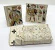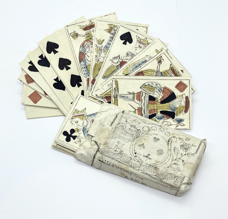 RARISSIME JEU DE CARTES AQUARELLÉ AU POCHOIR AU XVIIIE SIECLE.Il est à l’état de neuf car, spécificité rarissime, le papier de soie d’emballage a été conservé (un peu fripé). On y devine les morts Cartes fines Lyon.Bibliographie : D’Allemagne (I. pp. 115-116).The Cary collection, Yale, FRA80 ou FRA82. Les deux exemplaires de ce jeu conservés dans la collection Cary de Yale sont incomplets.