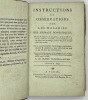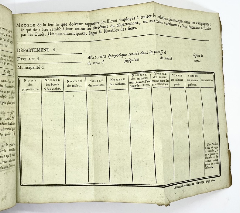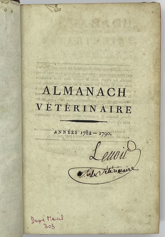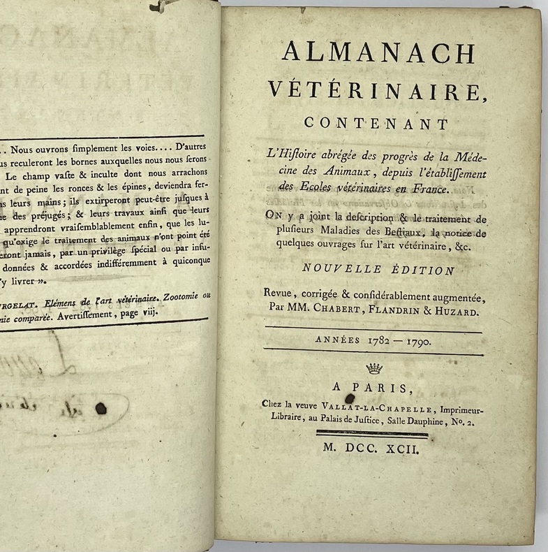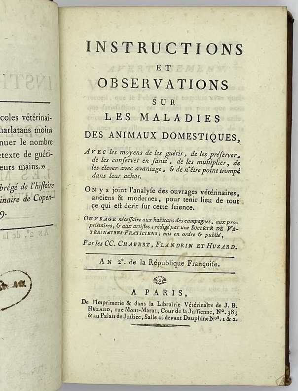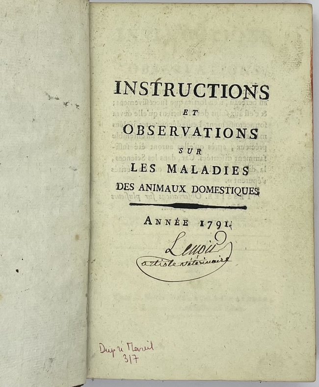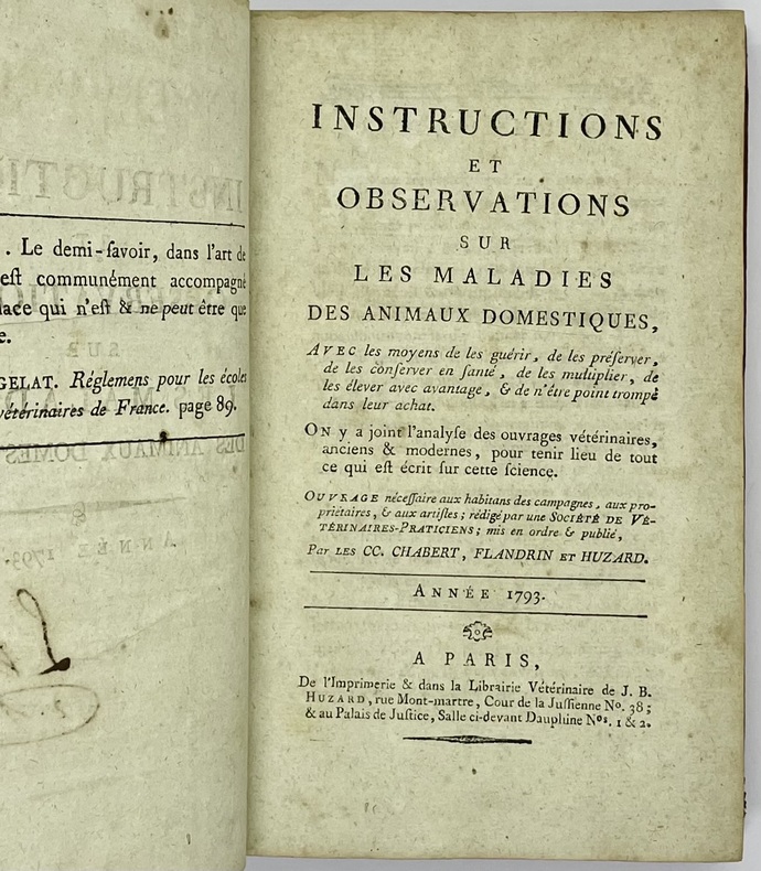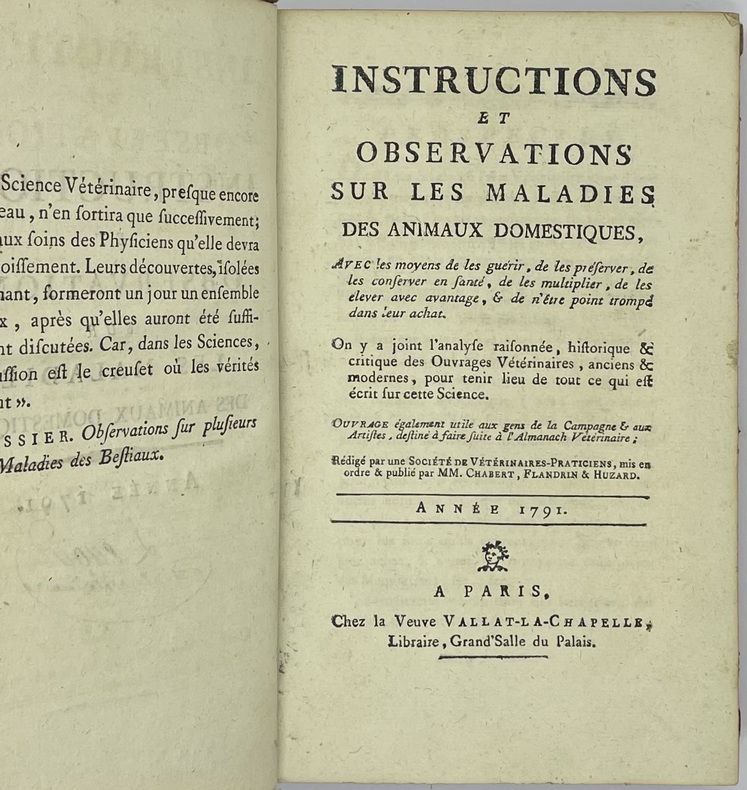Ouvrage publié sans nom d’auteur, principalement rédigé par Chabert, Flandrin et Huzard. Cet important travail visait à vulgariser les progrès de la médecine vétérinaire à la fin du XVIIIe siècle. D’abord publié sous le titre d’Almanach vétérinaire, en 1782, in-12, puis en 1792, in-8, l’ouvrage prit ensuite celui de Instructions et Observations sur les Maladies des Animaux domestiques. La collection complète contient 6 volumes, chacun publié séparément à un nombre différent d’éditions plus ou moins augmentées, sans indication de tomaison. La bibliographie de cet ouvrage est singulièrement embrouillée.Trois planches hors texte : une dans le tome I et 2 dans le tome III.Déchirures à deux planches sans manque, reliures assombries et frottées.- Signature de l’époque sur tous les volumes Lenoir artiste vétérinaire.