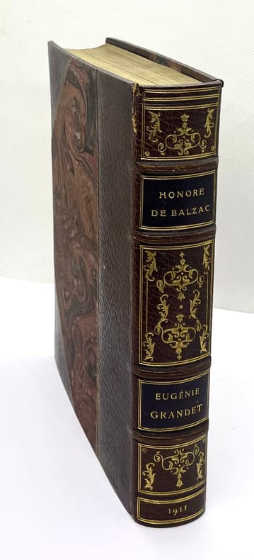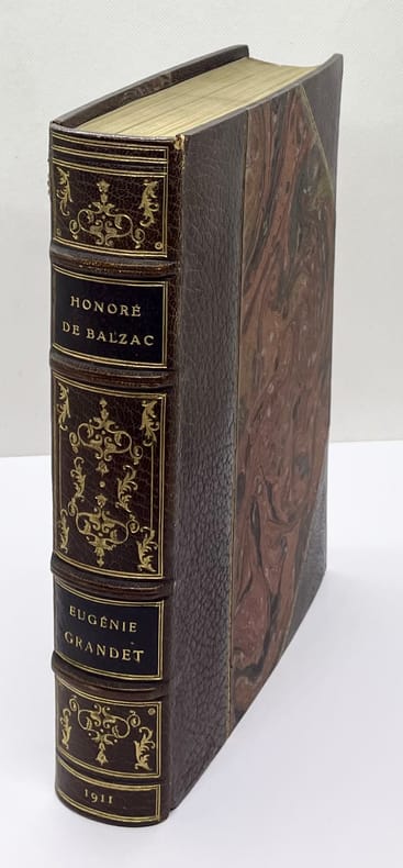 Précieuse édition originale d’ « Eugénie Grandet », chef-d’œuvre balzacien, conservée dans l’une des rarissimes reliures de l’époque non tomées spécialement réalisée à Paris pour cette œuvre remarquable. Carteret, I, 69 ; Vicaire, I, 197. Ce volume « contient : ‘Eugénie Grandet’ (inédit). C’est l’édition originale de ce roman » (Vicaire). L’édition originale d’« Eugénie Grandet », l’une des plus recherchées de l’œuvre balzacienne, se trouve généralement insérée dans les douze volumes tomés des « Études de Mœurs au XIXe siècle » et les bibliographes attirent notre attention sur le fait que, vendu isolément, l’on a généralement masqué la tomaison du volume sous un fleuron moderne. M. Clouzot (p. 21) écrit notamment : « Eugénie Grandet se vend souvent séparément. Ce volume en reliure d’époque porte en principe un numéro de tomaison au dos, chiffre souvent dissimulé sous un fleuron moderne. Se méfier. » D’où l’intérêt majeur de cet exemplaire relié séparément dès l’origine sans mention de tomaison. Eugénie Grandet publié vers la fin de 1833 est le premier des grands livres de Balzac. Quelques-uns disent son chef-d’œuvre. Dans la ville de Saumur, le terrible père Grandet, ex-tonnelier, a réuni grâce à une série d’heureuses spéculations une fortune qu’il augmente avec une héroïque et atroce avarice. Le lecteur est transporté au sein de la famille, qui comprend la fidèle servante Nanon, l’épouse de Grandet, femme sans volonté, et la fille de Grandet, la jeune Eugénie, un être d’une lumineuse beauté à l’âme noble et délicate, autour de laquelle se combattent les cupidités et les intrigues des deux grandes familles bourgeoises de la ville, les Cruchot et les Des Grassins, qui espèrent s’unir par un mariage à la très riche héritière. Le soir même de l’anniversaire d’Eugénie, occasion d’une petite fête chez les Grandet, arrive à l’improviste Charles Grandet, jeune Parisien élevé dans le luxe et l’oisiveté, fils d’un frère du vieux Grandet qui, à la suite d’une faillite de quatre millions, s’est fait sauter la cervelle. Le vieil avare apprend la mort de son frère par une lettre qui le prie de prendre soin de la liquidation et de fournir à son fils des moyens d’aller tenter fortune aux Indes. Durant les quelques jours que passe dans la maison ce jeune homme bouleversé par le malheur prend naissance chez Eugénie une profonde passion pour son cousin, un véritable grand amour que Charles, ému, semble partager. Puis le jeune homme part, non sans avoir prêté des serments d’éternelle fidélité. Cette première partie est la meilleure : les personnages ont un relief incomparable, les faits s’entremêlent et se développent d’une façon classique, l’amour d’Eugénie enfin est saisi avec une délicatesse qui ne fut peut-être jamais plus atteinte par Balzac. Le reste n’est que la conclusion, l’histoire d’Eugénie dépendant entièrement de ce premier épisode décisif auquel s’oppose le portrait classique de l’avare, le personnage du père, qui prend peu à peu une terrible importance. L’œuvre resplendit d’une force d’art incomparable : le personnage d’Eugénie et celui de son père sont justement considérés parmi les plus heureux de tous les portraits dus à la plume de ce créateur de génie. Le style se montre, ici, mobile, pénétrant et beaucoup moins minutieux et lourd que dans bien d’autres œuvres du même romancier ; pas de longues digressions morales qui, si elles confèrent à certaines de ses œuvres un réel intérêt, en gâtent souvent la pureté de lignes. L’un des plus beaux exemplaires répertoriés, non lavé et presque totalement dénué de rousseurs, de l’un des chefs-d’œuvre de la littérature mondiale.