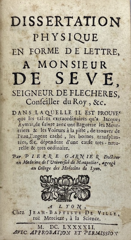Édition originale de ce rare et curieux ouvrage sur la baguette divinatoire, l'un des tout premiers à avoir été publiés sur ce sujet. L’auteur cherche à prouver la réalité des dons de Jacques Aymar-Vernay, paysan de Saint-Véran en Dauphiné lui permettant de découvrir, à l'aide d'une baguette de coudrier, les malfaiteurs, les choses volées, les eaux souterraines et les métaux. Après les « preuves scientifiques », le livre offre le récit du meurtre en 1692 d’un couple de vignerons élucidé grâce au sourcier et quelques autres expériences faites avec les forces de police.Bon exemplairemalgré quelques restaurations la reliure, notamment aux mors.Provenance : de la bibliothèque scientifique et ésotérique du Dr Villaret, avec ex-libris macabre.
