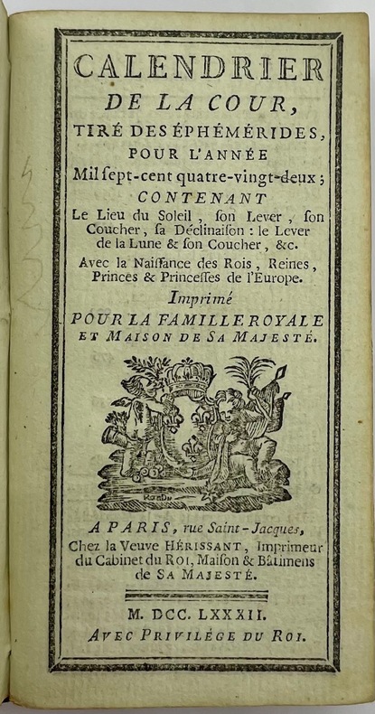 « Calendrier « inventé par le sieur Jacques Colombat », spécialement destiné aux rois de France, qui fut successivement imprimé par Jacques Étienne Colombat, puis par Hérissant et la veuve Hérissant. [...] En outre des renseignements mentionnés au titre, on y trouve tout ce qui est secrétaires (État, Finances, Commerce), députés des villes et des colonies pour le commerce, huissier des conseils, clergé, ordres, etc. Ce calendrier, comme l’Almanach Royal, est une précieux document pour l’histoire officielle de la Cour. » (Grand-Carteret).Grand-Carteret, Les Almanachs français, 92. Saffroy, Bibliographie des almanachs et des annuaires, 204. - - VENTE PAR CORRESPONDANCE UNIQUEMENT