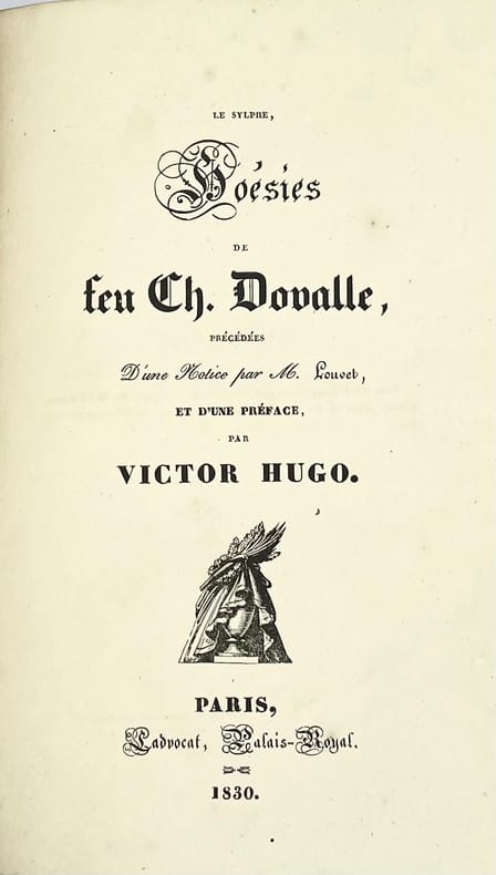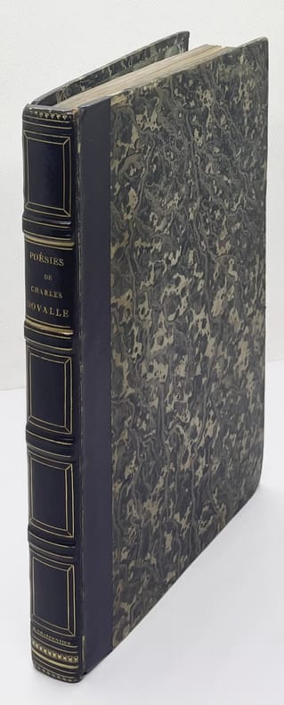 Édition originale posthume rare, préfacée par Victor Hugo, parue un an après le décès tragique de Dovalle.L’auteur, né en 1807, avait révélé ses dons poétiques dès le collège en Maine-et-Loire. Il vint s’installer à Paris comme journaliste mais fut tué en duel par Mira, directeur du théâtre des Variétés pour un calembour dans une critique. Ses amis firent publier le recueil de ses poésies, mais la balle qui le tua ayant d’abord percé le manuscrit serré sur sa poitrine, le typographe respecta le manque de quelques lettres témoignant de cette fin désastreuse.A la fois frais et sensuels, les vers de Dovalle sont empreints de jeunesse, de grâce et d’abandon. D’après Victor Hugo, "quiconque lira le recueil de M. Dovalle sera-t-il longtemps poursuivi par la jeune et pâle figure de ce poète, souriant comme André Chénier, et sanglant comme lui" (préface).Ouvrage imprimé avec soin sur papier vélin de qualité, orné de nombreux petits bois gravés.Bel exemplaire en reliure de l’époque.Vicaire III, 2