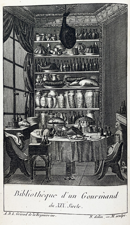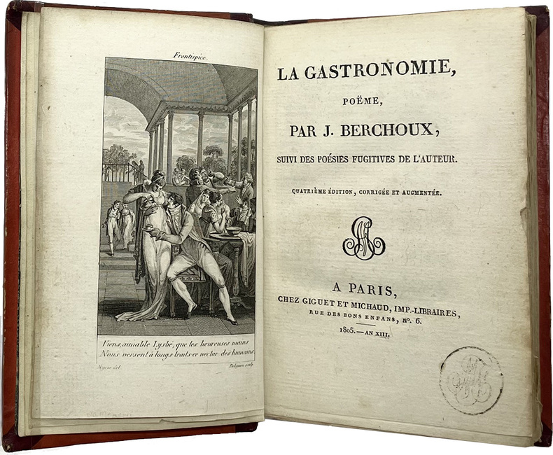 Paris, Guiguet et Michaud, Paris, Guiguet et Michaud 1805 an XIII ; in-16, demi-basane brune, dos lisse orné, tranches jaspées. (Reliure de l'époque.) "266 pp. ; frontispice et 3 gravures hors-texte de Myris et Monsiau, gravés par Bovinet, Delvaux et Baquoy.""ÉDITION EN PARTIE ORIGINALE. Oberlé signale dans Les Fastes de Bacchus et de Comus « deux tirages de cette quatrième édition, l'un sur papier fort contenant les 4 gravures [notre exemplaire] et un autre sur papier ordinaire, plus fin avec seulement une gravure en frontispice... À la suite de cette quatrième édition, on trouve divers poèmes parmi lesquels des stances à Chateaubriand. » « Ce spirituel badinage publié pour la première fois en 1800 assura à l'auteur une gloire durable. Réimprimé sans cesse, il deviendra un des « classiques de la table ». La Gastronomie fut traduite en plusieurs langues ; certains vers devinrent des proverbes « Un poème jamais ne valut un dîner » ou encore « Rien ne doit déranger l'honnête homme qui dîne ». Ce livre est une excellente illustration de la joie de vivre remise à l'honneur par le Directoire. » Oberlé Fastes 386. - Vicaire 84 - Cohen 131 - Cagle 73 - Crahan 479 - Simon 196. Plaisant exemplaire bien relié à l'époque, qq. rousseurs."