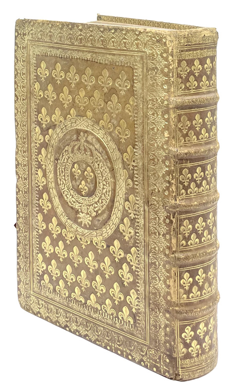 Poitiers, Abraham Mounin, 1644 ; in-folio de [16] ff., 666-1 f. bl., 69 pp., [5] ff., 75 pp, [9] ff., [3] ff., reliure de l’époque basane blonde, les plats et le dos entièrement décorés de motifs dorés, fleurs de lys et armes de France, roulette intérieure dorée, tranches dorées.