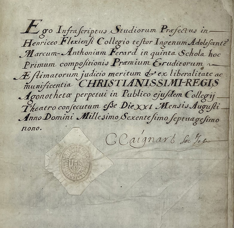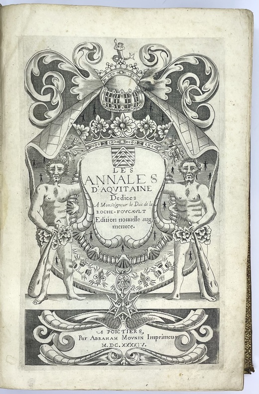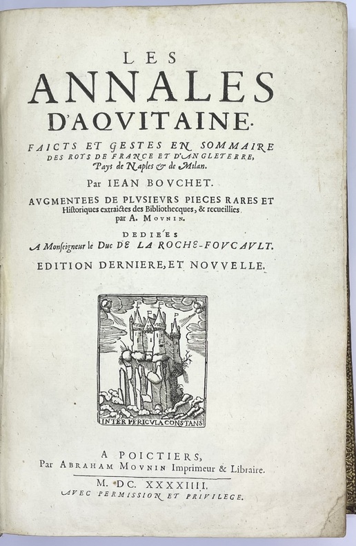 Édition augmentée, la meilleure selon Brunet, de cette précieuse étude sur l’Aquitaine médiévale et Renaissance, parue pour la première fois en 1524. Elle est ici augmentée de plusieurs pièces. Bouchet « s’inscrit dans la tradition des grands chroniqueurs de l’histoire de France, mais il inaugure également la méthode historique moderne par l’attention aux sources régionales de préférence aux compilations » (Régis Rech). L’historien poitevin relate notamment ses souvenirs de jeunesse sur ce qu’on lui racontait de Jeanne d’Arc, brûlée vive quarante ans avant sa naissance.Titre-frontispice gravé et portrait du dédicataire, le duc de la Rochefoucauld.Reliure de prix décorée aux armes de France. Elle fut offerte en 1679 à Marc-Antoine Férard [de la Chesnaie], écolier méritant à l’école de la Flèche tenue par les Jésuites. L’école forma notamment Descartes au XVIIe siècle. C’est aujourd’hui le Prytanée militaire, dont la bibliothèque actuelle possède un exemplaire de ce livre.Restauration intérieure aux charnières, gardes renouvelées. L’exemplaire demeure très plaisant.