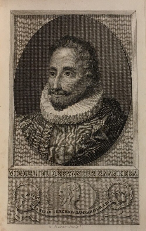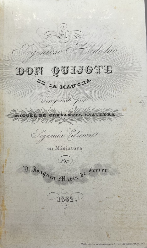 Rare première édition en un volume par Didot en caractères minuscules aux frais de Joaquin Maria de Ferrer, ancien président des Cortès. Elle est illustrée d'un portrait de l'auteur, d'un titre gravé sur bois, d'une carte à double page des voyages de Don Quichotte, et de 8 planches hors texte, sur chine monté,(9 gravures sur acier gravées par Stalker, d’après l’édition de 1797 de l'imprimerie royale). Les reliures à la cathédrale de Simier sont célèbres, spécialement sur ces petits Don Quichotte qui en sont revêtus. Très belle reliure romantique en superbe état de René Simier, qui fut « relieur du roi » sous la Restauration, et un petit bijou de typographie. Henrich, 79. Ford Lansing, p. 9. Brunet I-1750. Palau 52051. Rius 79. Suné 86. N°93 cat.Bardon .