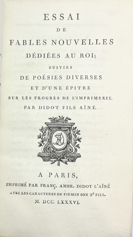 Édition originale de ce recueil de Pierre Didot (1761-1853), imprimée sur les presses de son père François-Ambroise avec les premiers caractères dessinés par son frère Firmin. Les trente-quatre fables sont suivies de poésies diverses et de la fameuse Épître sur les progrès de l'imprimerie (50 pp.). Véritable hymne en vers à l’art du typographe-imprimeur, elle est accompagnée de notes très pertinentes, en particulier sur les inventions du papier vélin et de la presse à un coup dont les Didot revendiquent l’antériorité malgré les prétentions de Laurent Anisson.Tirage à petit nombre. Bel exemplaire tiré sur papier vélin, revêtu d’une reliure en maroquin rouge de Lortic l’un des tout meilleurs relieurs parisiens du XIXE siècle.Bibliographie : Brunet, II, 701. - Les Didot, 1698-1998, nº 59 : « Les caractères de transition n’ont pas encore toute la sévérité des fontes postérieures. » Updike, Printing Types, I, p. 227 et II. p. 176 : « An exquisite little volume. »