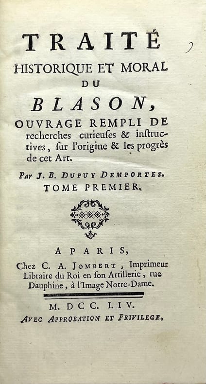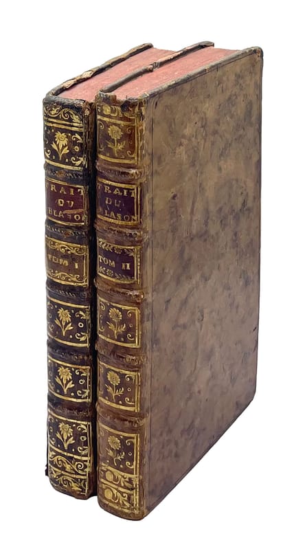 Paris C. A. Jombert 1754 2 vol. relié 2 vol. in-12, veau brun marbré, dos lisses ornés de fleurons dorés, pièces de titre de basane rouge, filet doré sur les coupes, tranches rouges, VIII + [3 p.] + 307 pp. + [4 p.] et VI + 374 pp. Édition peu commune de cet ouvrage dans lequel on trouve "une explication sur la signification symbolique des pièces et meubles du blason" (Saffroy, I, 2313). Ex-libris manuscrit "de Léonard 1759". Mors supérieur du tome 2 fendillé en pied, coins un peu frottés, sinon agréable reliure d'époque.