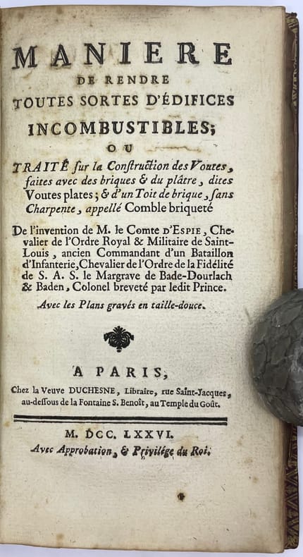 Edition strictement identique à l’originale de 1754 pour le texte, mais dans laquelle on a remplacé les 2 feuillets de dédicace au duc de Belle-Isle, par un Avant-propos de xix pages. Le traité est illustré de 2 GRANDES PLANCHES DÉPLIANTES d’architecture expliquant comment des voûtes en brique protègent les bâtiments de la propagation du feu.Précieux et charmant exemplaire aux armes du comte de Provence (1755-1824), futur Louis XVIII.Déchirure sans manque à la première planche. Reliure légèrement frottée.Bibliographie : Olivier, Hermal et Roton, Manuel de l’amateur de reliures armoriées françaises, 2547, fer 5.