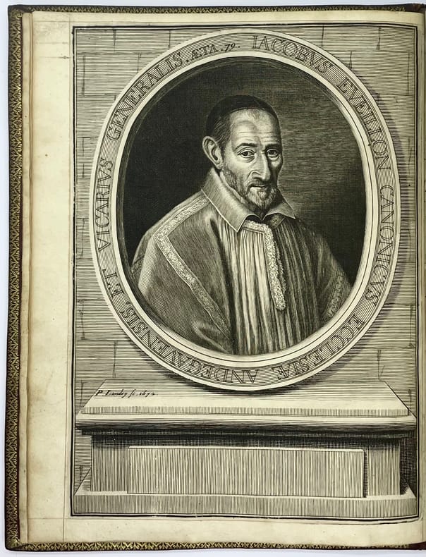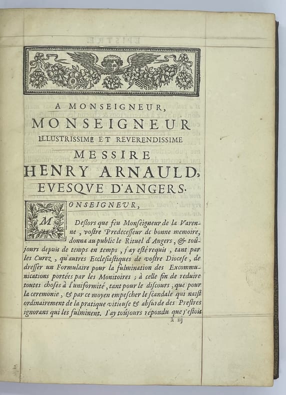 Deuxième édition augmentée, de ce traité sur l’excommunication dédié au Janséniste HernyArnauld, évêque d’Angers. L’auteur s’y prononce avec véhémence contre l’excommunication des animaux, encore très pratiquée dans les campagnes.La table des matières donne de nombreux renvois à des anecdotes et cas réels.Portrait-frontispice gravé par Pierre Landry.Traces d’humidité au plat inférieur, sinon bel exemplaire en maroquin rouge, au texte réglé à l’encre rouge.Ex-libris du monastère de la Pierre-Qui-Vire gravé vers 1950.