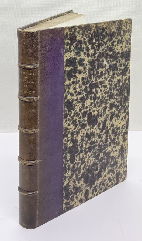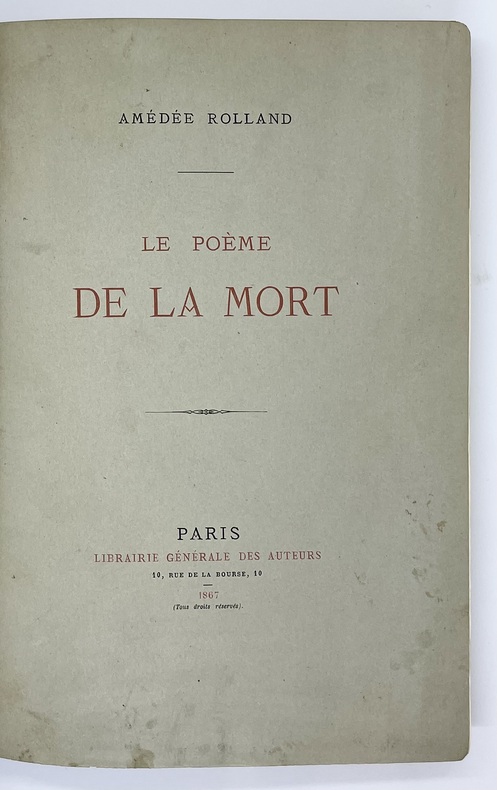 Édition originale extrêmement rare. L'auteur, mort encore jeune, est demeuré dans le panthéon littéraire pour sa pièce Cadet Roussel. Le Poème de la Mort « marque par un grand effort la fin de cette vie épuisée par la recherche de la singularité et de la fausse force ; j'appelle ainsi celle qui se montre autrement que par le résultat, - Il y a dans ce poème de la Mort, comme dit M. A. Bersier, au milieu de beaucoup d'enflure et de déclamation, quelques tableaux sincères et frappants, les uns par l'énergie, les autres par le genre -. C'est le premier et le dernier grand effort épique d'Amédée Rolland et son œuvre vraie. » (André Lemoyne in Anthologie des poètes français du XIXe siècle, 1887). Ce jugement nous paraît encore trop sévère car ce poème allie au contraire simplicité et sincérité. Tirage sur papier vélin fort- Reliure sobre dans la couleur du demi-deuil. Dos passé. Vicaire, VI, 1176.