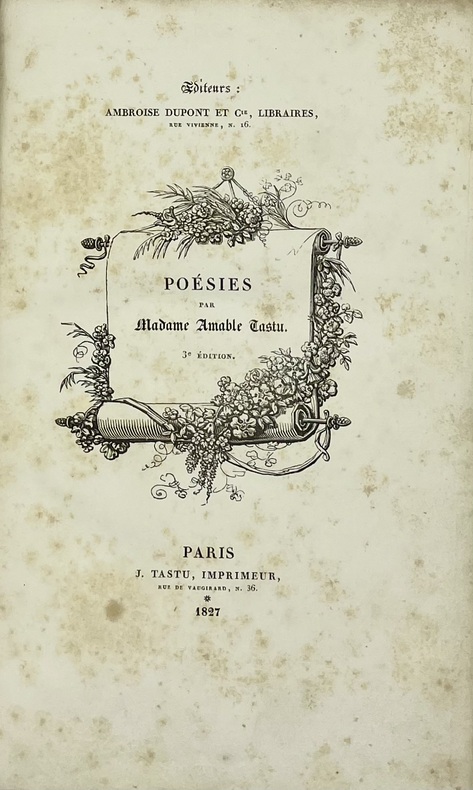Paris, Tastu, 1827; in-8 de [2] ff., frontispice, 344 pp., reliure de l'époque, veau glacé rouge, roulette à froid soulignée d'un filet noir en encadrement sur les plats, fleuron losangé frappé à froid au centre souligné d'un filet noir, dos à nerfs orné de motifs dorés et à froid, tranches dorées, roulette intérieure dorée (Martin).