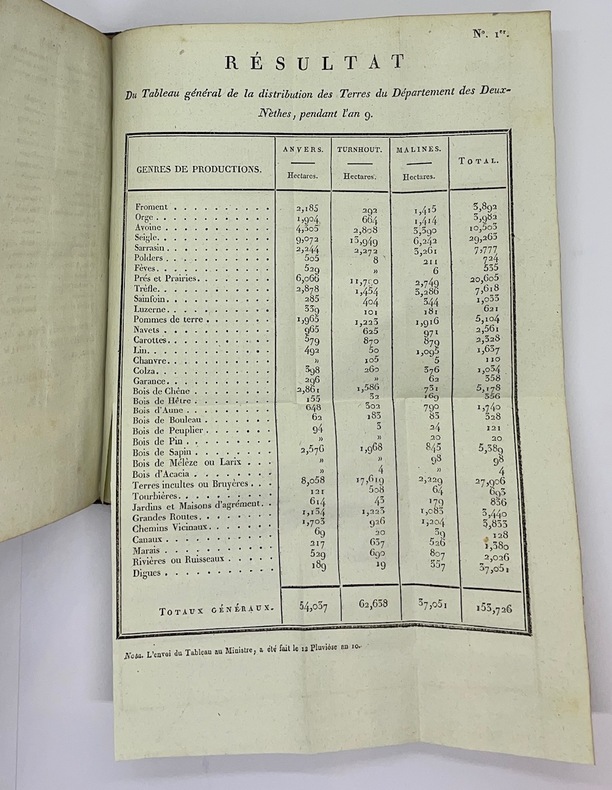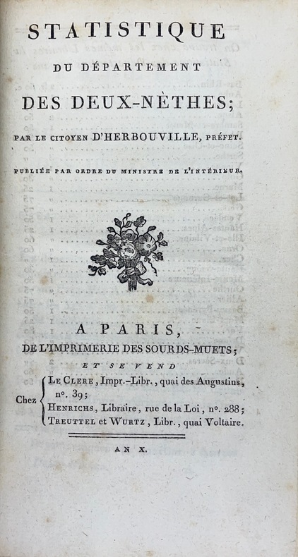 Rare document décrivant par le menu les Deux-Nèthes, département du Brabant conquis par l'armée française sur les Pays-Bas autrichiens en 1795 et qui sera partagé entre la Belgique et les Pays-Bas après la chute du premier empire. L'auteur fut préfet du département de 1799 à 1805. Il a conduit le premier une grande campagne de vaccination contre la variole et a lancé d'importants travaux pour créer le port d'Anvers. Il donne de nombreux renseignements sur les rivières et canaux, l'administration, les mœurs, les manufactures et les ressources agricoles du département. On trouve à la fin un catalogue de la faune et de la flore des Deux-Nèthes et 6 tableaux statistiques dont un dans le texte. Bel exemplaire relié en maroquin vert de grande qualité.Bibliographie : Monglond, La France révolutionnaire et impériale, V, 919.