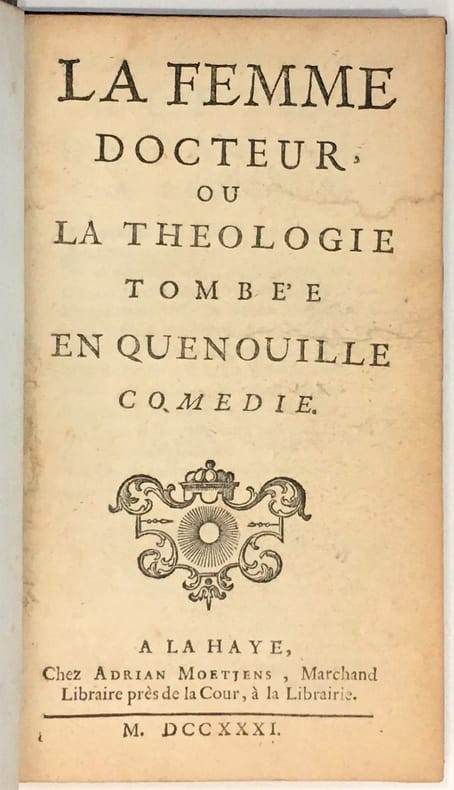 " Liège, chés la Veuve Procureur, 1731, in-8°, 124 pp, bound in contemporary full calf, decorated spine, top end of spine missingf, binding with some wear. With the tipped in engraved ex-libris of Alexis Martin ( engraved by Aglauis Bourvenne in 1868). With some modern notes on the recto side of the first fly leaf. See De Backer-Sommervogel Vol. I col. 1876. This is the second imprint of the first edition of this mock thetre play which deals with the quarrels between the Molinistes and the Jansenistes. The first imprint bears the year 1730. It was many times reprinted and also translated in Italian, Spanish, Dutch; Polish. The author sides with the Jansenistes ."