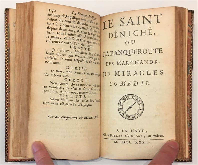 Troisième édition de cette pièce anti-janséniste publiée par le clan jésuite et qui connut un très grand succès. Selon les Nouvelles ecclésiastiques (année 1731 page 16) : « Le prévôt des marchands (de Lyon) en a fait saisir 200 exemplaires ; mais les Jésuites avaient eu soin de s'en fournir auparavant et d'en faire part à leurs amis. Leur P. Danton a présidé à l'impression, et l'imprimeur a allégué pour excuse au prévôt, que ce jésuite s'était chargé de tout et lui avait promis de le tirer d'affaire, si on l'inquiétait ». Barbier II, 443.- Soleinne III, 3772.- Gay II, 276. Relié à la suite, du même auteur : LE SAINT DENICHE OU LA BANQUEROUTE DES MARCHANDS DE MIRACLES. La Haye, Pierre l'Orloge, 1732. Édition originale de cette réfutation des miracles attribués au père Paris.- Horloge imprimée sur le titre.- Barbier IV, 408.- Soleinne III, 3778. Bel exemplaire en maroquin ancien. Ex-libris gravé par Sheffer avec devise Res optimae Res Pessimae.- Les deux frontispices manquent.