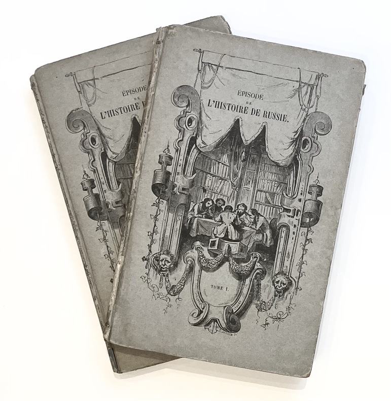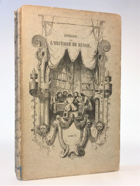 Intéressante péripétie de l'histoire russe relatée avec le style puissant de Mérimée. Contrefaçon belge parue l'année de l'originale. Elle est ornée de couvertures grises illustrées, de 2 frontispices et de 2 planches hors texte. Bon exemplaire dans le cartonnage d'éditeur illustré, malgré les coiffes et les dos frottés.- Vicaire IV, 733 (pour l'édition originale).