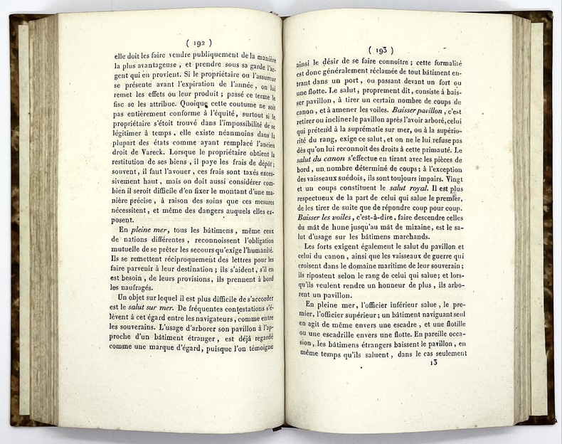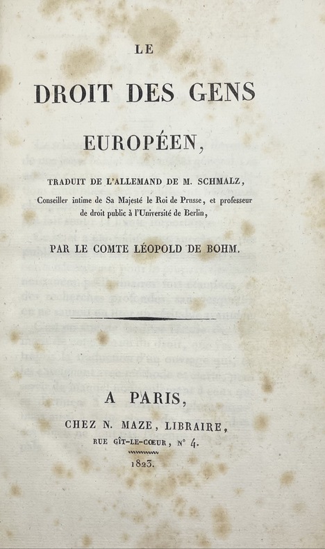 Édition originale de la traduction française qu'on doit au comte Léopold de Bohm. L'auteur était conseiller du roi de Prusse et professeur de droit public à Berlin. L'ouvrage traite du droit européen sous le rapport de la diplomatie, du commerce, du droit maritime, des alliances et de la neutralité, etc. Il n'a pas été réimprimé et se trouve très difficilement (un exemplaire à Sainte-Geneviève, 3 à Tolbiac). Exemplaire du baron Ruty, conseiller d'État en 1813 et pair de France en 1819 (ex-libris héraldique).- Galeries de vers au mors supérieur et réparation d'amateur à la coiffe.