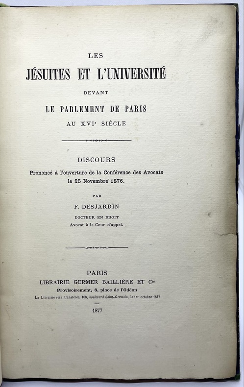 Paris, Librairie Germer Baillière et Cie, 1877 ; grand in-8, 55pp., demi-maroquin noir, dos à nerfs, gardes au peigne avec pochette au premier contreplat.
