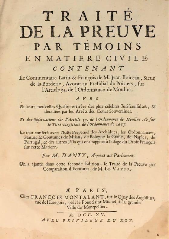 DANTY (N)Traité de la preuve par témoins en matière civile,contenant le commentaire latin & français avec plusieurs nouvelles questions tirées des plus célèbres jurisconsultes & décidées par les Arrêts des Cours Souveraines. Et des Observations sur l'Article 55. de l'Ordonnance de Moulins, & sur le Titre vingtième de l'Ordonnance de 1667. Le tout conféré avec l'Edit Perpetuel des Archiducs, les Ordonnances, statuts & Coutumes de Milan, de Bologne la Grasse, de Naples, de Portugal, & des autres païs qui ont rapport à l'usage du Droit français sur cette Matière ; avec le traité de la preuve par comparaison d'écrituresParis, Montalant, 1738. In-4°, reliure plein cuir (abimée, manques importants), [26]-699 pp., intérieur assez bien conservéAssez rare
