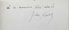 Paris Hetzel 1866 1 vol. Relié in-12, demi-chagrin rouge, dos à nerfs orné de fleurons dorés, tête dorée, XI + 334 pp. Edition originale de ce recueil de plaidoiries et discours du grand avocat et homme politique républicain (1809-1880), dont un texte sur la propriété littéraire. Exemplaire enrichi d'un envoi autographe signé de l'auteur à son gendre, l'avocat Paul Maritain, lui-même père du philosophe Jacques Maritain. Bel exemplaire, sans rousseurs et bien relié à l'époque.