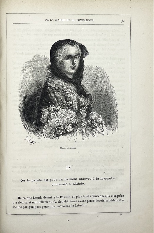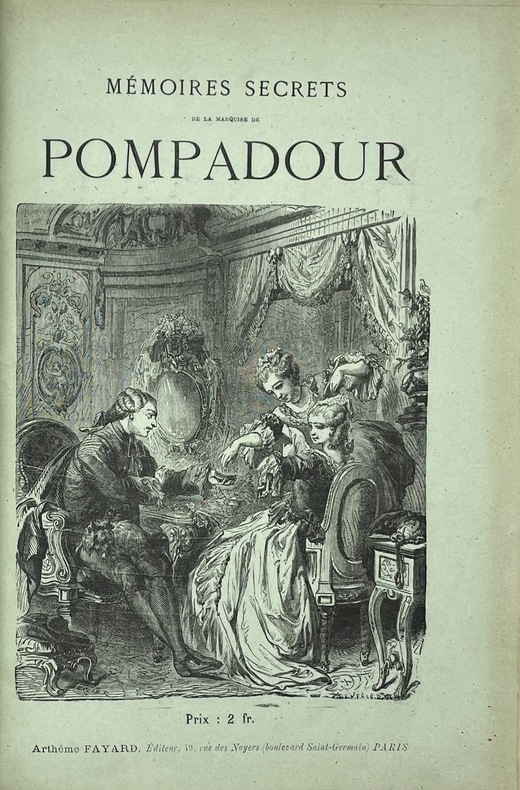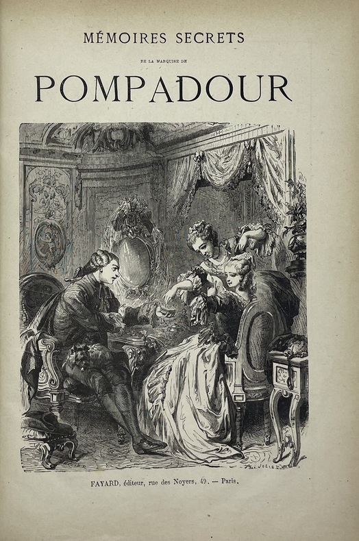 Charmante publication populaire qui semble très peu commune. Elle est ornée de 12 portraits gravés sur bois dans le texte et d'une grande figure sur la couverture (reprise sur le titre). Auteur de la fameuse Auberge sanglante, Jules Beaujoint propose une histoire romancée de l'ascension de la marquise de Pompadour. Le récit débute par le vol de la correspondance secrète de la marquise survenu dans son château de Choisy-le-Roi. C’est sur ces documents que l'auteur prétend s'appuyer. Jolie reliure ornée aux petits fers. Menus frottements.