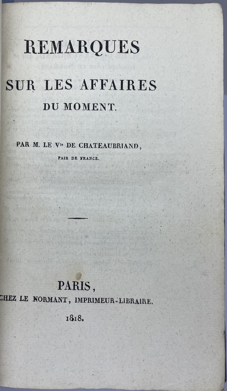 12 vol. in-8 br. : De Buonaparte, des Bourbons et de la nécessité de se rallier à nos Princes légitimes, pour le bonheur de la France et celui de l'Europe, Mame Frères, Et se trouve chez Le Normant, H. Nicole, Paris, 1814, 87 pp. sous couv. blanche muette [ On joint : ] Du Système politique suivi par le Ministère. Par M. le Vicomte de Chateaubriand Pair de France, Le Normant, Paris, 1817, 64 pp. sous couv. muette [ Edition originale ] [ On joint : ] Remarques sur les Affaires du Moment, Chez le Normant, Paris, 1818, 36 pp. sous couv. muette[ Edition originale ] [ On joint :] Lettre à un Pair de France, [ 1ère lettre ] Le Normant Père, Paris, 1824, 44 pp. ous couv. muette [ Edition originale ] [ On joint : ] Lettre à un Pair de France,[ 2e lettre ] Le Normant Père, Paris, 1824, 88 pp. sous couv. muette [ Edition originale ] [ On joint : ] De la Censure que l'on vient d'établir en vertu de l'article 4 de la loi du 17 mars 1822, Troisième édition, Le Normant Père, Paris, 1824, 44 pp. [ On joint : ] Les Amis de la Liberté de la Presse. Marche et Effets de la Censure, Le Normant Père, Paris, 1827, 32 pp. [ Edition originale ] [ On joint : ] Opinion de M. le Vicomte de Chateaubriand Pair de France, sur le Projet de Loi relatif à la Police de la Presse. Deuxième édition, Chez Ladvocat, Paris, 1827, 104-16 pp. (Prospectus des Oeuvres complètes) sous couv. imprimée [ On joint : ] De la Restauration et de la Monarchie élective, ou Réponse à l'interpellation de quelques journaux sur mon refus de servir le nouveau gouvernement, Chez Le Normant Fils, Paris, 24 mars 1831, 48 pp. sous couv. muette [ Edition originale ] [ On joint : ] De la nouvelle Proposition relative au Bannissement de Charles X et de sa Famille, ou Suite de mon dernier écrit : De la Restauration et de la Monarchie élective, Le Normant Fils, Paris, octobre 1831, 155 pp. et 2 ff. sous couv. imprimée [ Edition originale ] [ On joint : ] Mémoire sur la Captivité de Mme la Duchesse de Berry, Le Normant Editeur, Paris, 1833, 121 pp. et 2 ff. sous couv. imprimée [ Edition originale ] [ On joint : ] Discours prononcé à la Chambre des Pairs par M. le Vicomte de Chateaubriand à l'occasion de la mort de M. le Comte de Sèze le 18 juin 1828, (Extrait du Moniteur de 1828), Typographie de Firmin Didot Frères, Paris, 1861, 30 pp. sous couv. imprimée