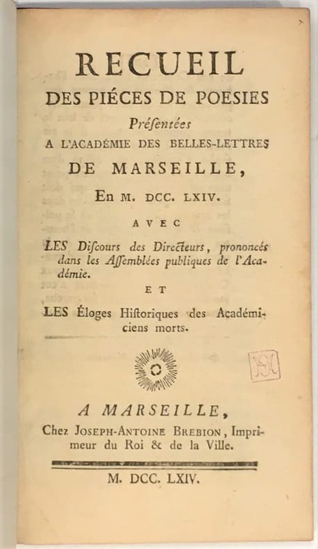 Édition originale rassemblant de nombreuses pièces d'intérêt régional : dissertation sur l'ancienneté de Marseille, éloge de M. de Chalamond, discours sur la législation de Marseille, etc. Cachet de la bibliothèque de Gustave Mouravit, membre de l'Académie d'Aix à la fin du XIXe siècle. Il possédait de nombreux livres curieux, toujours bien reliés. Charmante reliure en maroquin décoré de l'époque.