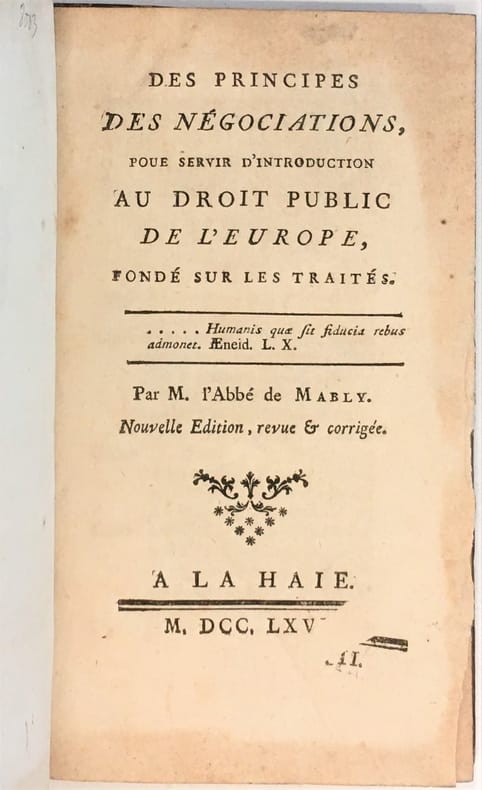 Rare first edition of one of Mably's most important works. ""His principes des negociations, which was to serve as an introduction to the Droit publique [...] was a courageous attack on the foreign policies of the European powers, and a plea for more rational and honest methods, not only for the sake of justice and humanity, but because they are actually profitable."" (Whitfield, Ernest A., Gabriel Bonnot De Mably, New York, 1969).Gabriel Bonnot de Mably ( 1709 - 1785), was a French philosopher and politician. He was one of the 18th century's most popular writers but largely passed into obscurity in the 20th century. His works contributed to the later concepts of both communism and republicanism. Some have enrolled him in the French School of Utopianism: ""Here also is the beginning of the French School of Utopian Communism properly so called. The Abbé de Mably (1709-1785) merits attention for his singularly clear exposition of the fundamental doctrine of equality: ""The sentiment of equality if nothing else than sentiment of our dignity"" men have become slaves by letting it grow feeble, and only by revivifying it will they become free""."" (Catlin, George. A History of Political Philosophers, London, 1950).More recent research suggests another approach to Mably's thinking: ""Mably should be seen as neither a proto-socialist nor a reactionary thinker, but as a republican - a classical republican, in fact, whose writing represents a later Gallic contribution to the political tradition founded by Machiavelli and Harrington. He is not only interesting as the personification of the revolutionary spirit and as a level-headed reformer, but because he formulated principles which have since been either accepted or re-discovered."" (Wright J. History of Political Thought, Volume 13, Number 3, 1992 , pp. 391-415).