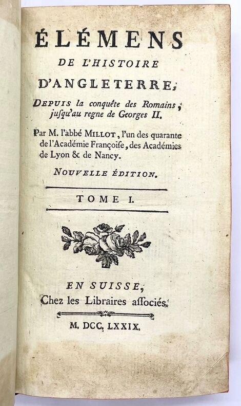 Précepteur du duc d'Enghien, l'auteur fut aussi archevêque de Lyon, prédicateur du Roi, et entra à l'Académie française en 1778. Il s'appuya pour la rédaction de cet ouvrage sur les travaux de deux de ses prédécesseurs : Rapin Toyras et Hume. L'édition originale parut en 1769. Bel exemplaire. Chaque volume porte l'ex-libris d'une des bibliothèques de Napoléon Ier avec ses armes gravées sur bois.