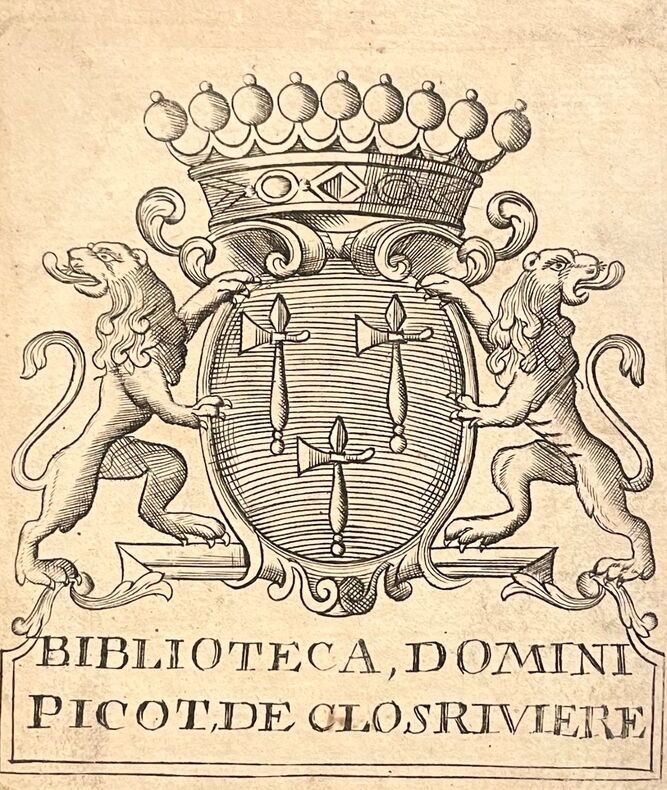 Seconde édition de la traduction des quatre premiers livres des Épîtres de Pline par Silvestre de Sacy, parue l'année de l’originale. Le recueil se compose de 30 lettres qui ,« quoique peu fécondes en renseignements historiques, sont, […] les témoignages les plus détaillés qui nous restent sur le règne de Trajan. » (Larousse). Le volume porte les marques de trois provenances : 1) cachet humide à l'encre rouge sur le titre : L'ABBÉ DE VERTOT, historien français d'origine normande (1655-1735). ; 2) ex-libris héraldique Picot de Closrivière (1735-1820), prêtre auquel on doit plusieurs ouvrages de piété ; 3) ex-libris armorié (recouvrant celui de Picot de Closrivière) d'Antoine-René de Voyer de Paulmy d'Argenson (1722-1787). « Il avait formé une immense collection des plus précieuses et des plus riches, qu'il vendit au comte d'Artois et qui constitue le fonds principal de la Bibliothèque de l'Arsenal ». Olivier, Hermal et Roton, 1722. Mouillure marginale. Note manuscrite de l'époque grattée sur le titre entraînant une perforation. Manque de papier en marge de la page 211.