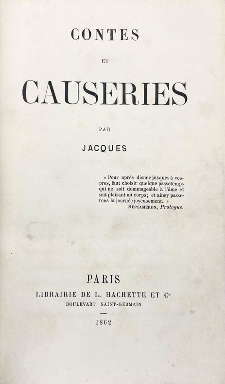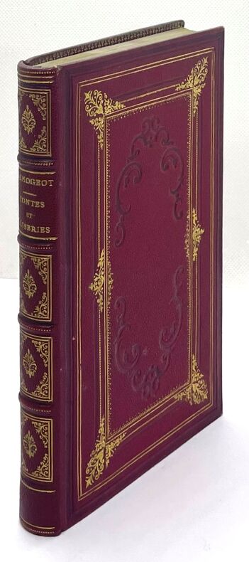 Édition originale rare de ce charmant recueil de contes en vers, d'inspiration badine, historique ou littéraire. L'auteur (1808-1894) était professeur de rhétorique et écrivit de nombreux ouvrages sur la littérature française et étrangère (voir n° ci-dessous). Publiant sous le voile de l'anonymat, Demogeot s'explique dans la préface : « … Le matin je suis sage, austère, je me range, Mais quand tombe le soir, la langue me démange… ». Très bel exemplaire relié en chagrin décoré pour l'auteur lui-même.
