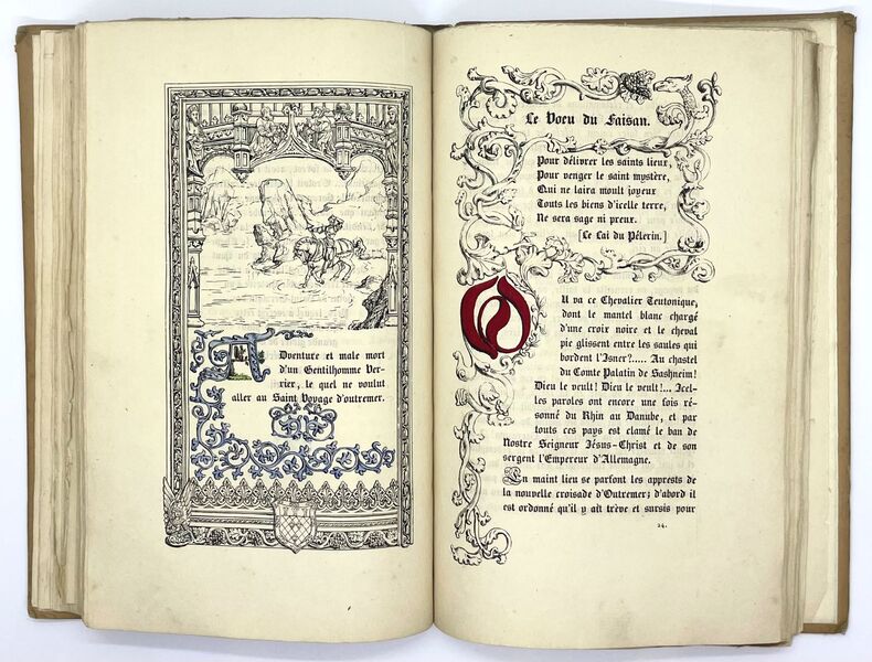 Paris, Firmin Didot, 1829. 23 x 13,5 cm, [3] ff., cxxxvij pp., [1] f. bl., 64 pp. Relié demi-veau glacé rouge à coins signé de Carayon, dos lisse orné d'un décor romantique, couverture et dos conservés. Exemplaire en très bel état. Édition présentée par Ferdinand Langlé et Émile Morice. Ce recueil assez peu courant est entièrement imprimé en lettres gothiques par l'atelier de Firmin Didot, imitant les manuscrits du XVe siècle. Cet ouvrage fait partie des impressions remarquables de la maison Didot. Il contient quatre chroniques « récitées par Cristofe Malivoir le jongleur, [...] en la grande salle du chastel d'Escorailles » : Le Droit de Nopçage, Le Jugement de Dieu, La Cour de Jussienne, Le Vu du faisant. Le texte est accompagné de 64 pages de notes explicatives. L'ouvrage est illustré de lettrines, ornements et de quatre vignettes gravées d'après H. Monnier et Eugène Lami. Les lettres et les ornements sont enluminés. Ex-libris d'Henri Lenseigne contrecollé sur le contre plat. Henri Lenseigne était un grand bibliophile président de la société "Les XX", vice-président de la société "Le livre contemporain", sa bibliothèque a été vendu aux enchères en 1930 et a fait l'objet d'un catalogue rédigé par Carteret.