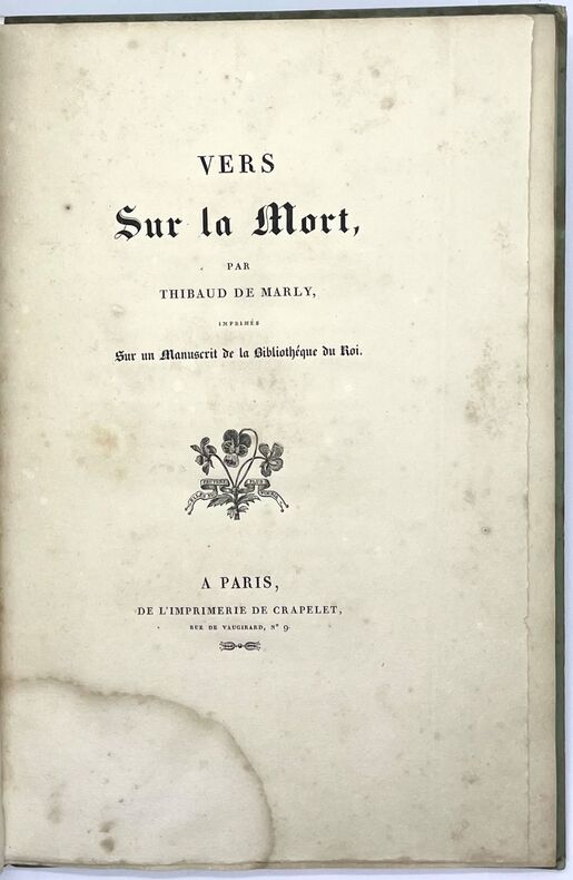 Édition princeps beaucoup plus rare que la seconde édition de 1835. Elle a été établie d'après un manuscrit du XIIIe siècle par Dominique-Martin Méon, conservateur à la Bibliothèque Royale qui a aussi fourni un glossaire et des notes. C'est le premier des 13 volumes de la collection de Crapelet Anciens monuments de l'histoire et de la langue françoise. Magnifique poésie dont le sens pourrait parfois échapper si l'on ne disposait du glossaire. L'auteur ne dédaigne pas les allitérations comme en témoigne le premier vers : « Mors qui m'a mis muer en mue,… » Fleuron de titre et petite vignette macabre en en-tête. Mouillure angulaire marginale et quelques rousseurs. Vicaire, II, 463.