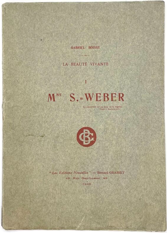 Première édition en librairie de cette étude à la gloire de l'actrice Caroline-Eugénie Segond-Weber, sociétaire de la Comédie Française ; le texte était déjà paru auparavant dans la Revue Hebdomadaire. Quatre planches hors texte reproduisent des photographies de l'actrice costumée affichant différentes expressions. Gabriel Boissy était publiciste ; il eut notamment l'idée de la flamme au tombeau du Soldat inconnu sous l'Arc de Triomphe. Envoi autographe de l'auteur à Fernand Fauvé. Légères taches et mouillures marginales, couverture un peu défraîchie.